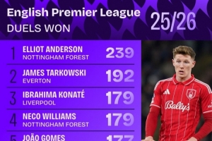 体育资讯3月9日讯 Squawka统计了本赛季球员在英超的对抗成功次数,并列出榜单,安德森是唯一对抗成功超过200次的球员。